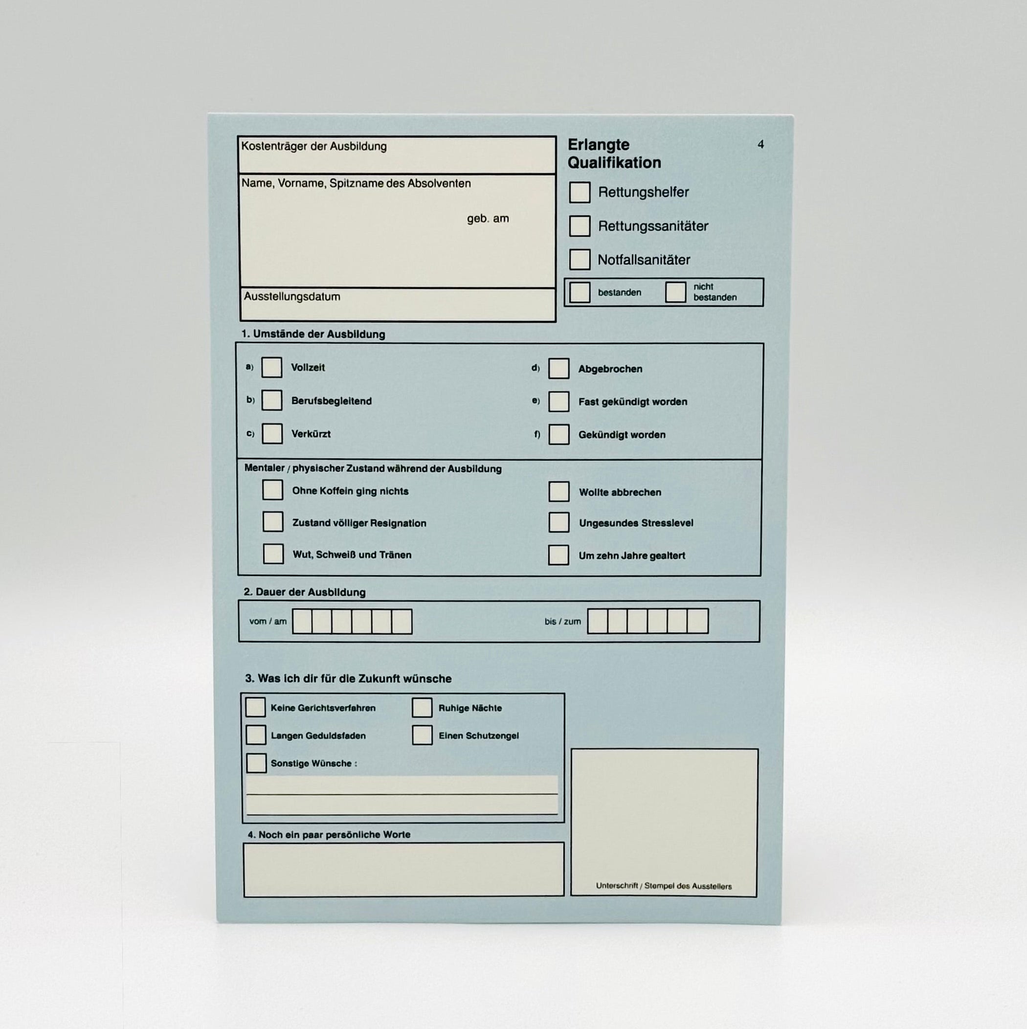 Durch meine eigene Arbeit im Rettungsdienst und mein privates Umfeld habe ich immer mal wieder nach passenden Karten oder kleinen Geschenken gesucht. Nachdem ich vor über einem Jahr mal wieder vergeblich nach einer Karte für eine bestandene Laufbahnprüfung gesucht habe, habe ich selber angefangen, Karten zu erstellen. Immer öfter habe ich mitbekommen, dass auch andere dieses Problem haben und so kam die Idee, den Emergency-Check-Shop zu gründen. Nach über einem Jahr Brainstorming rumprobieren, gestalten und Materialien testen, ist der Shop im Februar 2025 online gegangen.